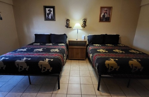 Saddle up and relax in our unique John Wayne-themed room! This well-appointed space features two comfortable queen-size beds, offering plenty of room for your whole party. Enjoy the convenience of a mini-fridge, microwave, and a 12-cup coffee maker in your small kitchenette, perfect for preparing simple meals and brewing your morning coffee. A private bathroom ensures your comfort and privacy.
