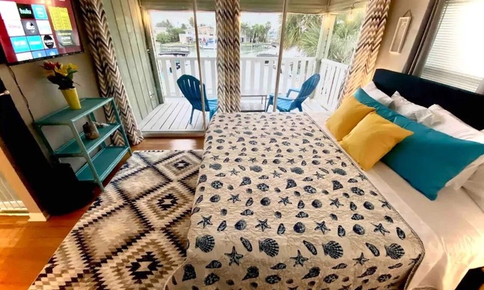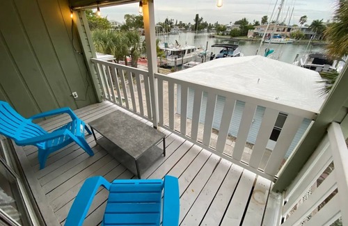 Soak up the old fishing village charm with a great second floor water view! This very well located apartment is just steps from Johns Pass with over 100 vendors! Short 5 min walk to the beach! This space has a large room with a king bed and smartTV that over looks the canal filled with boats. There is also a small bedroom with a full-size bed and TV with a fire stick! Enjoy a large kitchen with all the essentials! Coffee on the balcony, while looking for dolphin is the best way to start the day!