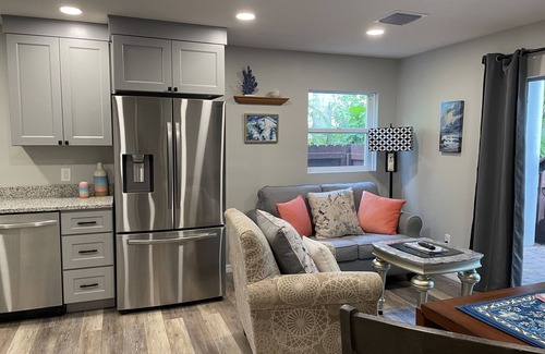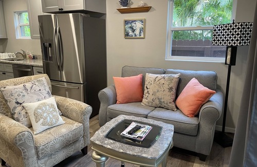 Our home away from home is a 1 bedroom, 1 bath.Open concept living with natural light coming in through all the windows. Gather around the kitchen table, while you cook up a wonderful meal in our fully stocked kitchen. Reminisce on your day while you sit outside on your private veranda or cozy up on the couch and watch a movie. Whatever you plans are on your trip, we hope that you feel the warmth of the home. Enjoy this newly remodeled 1-bedroom unit! This beautifully landscaped home is a private oasis! You can relax and unwind at the pool or zen area! Walking distance to the ICW including great restaurants and parks.