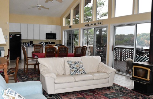 The property is on top of a hill overlooking the lake. The beautiful modern house has floor to ceiling windows across the front of the house that provide a stunning view of the large lake. Enjoy your morning coffee on the private deck, listening to fish jumping, birds chirping and splashing of waves against the dock. Our neighbors' beautiful chimes can be heard from one of the bedrooms, too. Everyone can catch a fish or two off of the dock. Local fish include sunfish, perch, small and large mouth bass and pikes. The water is perfect for swimming, kayaking, paddle boarding, jet skiing, boating or just relaxing in an inflatable tube or chair. Bring your boat or boats and dock them at your private docks.