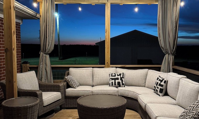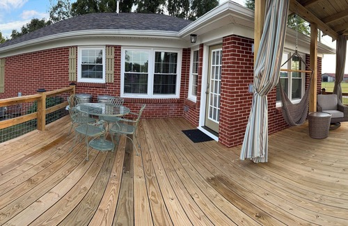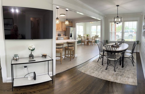 June’s Place was intentionally designed to provide everything a couple or family would need for a perfect weekend away from home. The main bedroom features a queen-sized bed, and the second bedroom has a full over queen bunk bed with an in-room TV. The spacious bathroom features a freestanding bathtub, a large, two-sink vanity, and a roomy shower. June’s Place also offers a utility room with a washer, dryer, and ironing board. The open concept floor plan features an adorable sunroom breakfast nook, well-stocked kitchen, inviting dining space, and cozy living room. The property includes a circular drive, which provides easy access for boats and trailers. After a long day on the lake, you can unwind in our relaxing outdoor space that features a fire pit, grill, and corn hole boards.