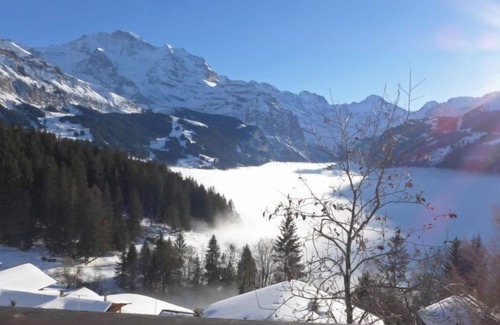 "Jungfrau a d Ledi", 2-room chalet 53 m2, on the upper floor. Spacious, partly renovated, modern and tasteful furnishings: living/dining room 30 m2 with 1 bed (90 cm, length 190 cm), dining table, cable TV and international TV channels (flat screen), radio and CD-player. Exit to the balcony. 1 room 14 m2 with 2 beds (90 cm, length 190 cm). Open kitchen (oven, dishwasher, 4 ceramic glass hob hotplates, toaster, kettle, electric coffee machine, Capsules for coffee machine (Nespresso) extra). Shower/WC. Oil heating. Balcony, south facing position, patio. Balcony furniture, deck chairs (2). Marvellous panoramic view of the mountains, the valley and Jungfrau. Facilities: Internet (WiFi, free). Please note: non-smoking house. Maximum 1 pet/ dog allowed.