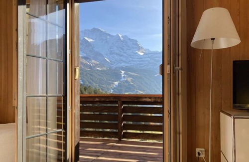 "Jungfrau a d Ledi", 3-room chalet 75 m2. Spacious, partly renovated, modern and tasteful furnishings: living/dining room 30 m2 with 1 bed (90 cm, length 190 cm), dining table, cable TV and international TV channels (flat screen), radio and CD-player. Exit to the balcony, south facing position. 1 room 14 m2 with 2 beds (90 cm, length 190 cm). Open kitchen (oven, dishwasher, 4 ceramic glass hob hotplates, toaster, kettle, electric coffee machine, Capsules for coffee machine (Nespresso) extra). Shower/WC. Oil heating. On the lower ground floor: (exterior staircase) 25 m2, 1 room with 2 beds (90 cm, length 200 cm). Exit to the patio. Sep. WC. Balcony furniture, deck chairs (2). Marvellous panoramic view of the mountains and the valley. Facilities: washing machine, dryer (extra). Internet (WiFi, free). Please note: one double bedroom is outside the apartment. Non-smoking house. Maximum 1 pet/ dog allowed. No internal connecting door between the floors.