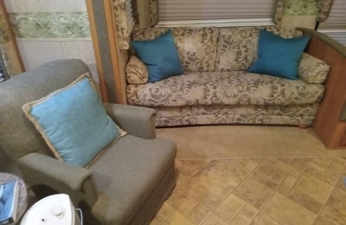Shared court yard with fire pit and screened in area with kitchenette available to guests as well as a sand shower (which you might perfer over the RV shower).