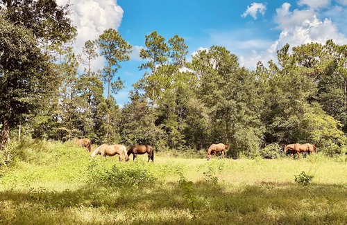 Unplug and reconnect with what really matters at this unique and tranquil getaway. During your Juniper Creek Cottage stay, you will enjoy some of the original charm and details of the updated 1950s home, along with the beauty and excitement of nature just outside the doors. Enjoy a cup of coffee on the front porch while watching the horses play across the street. Follow the babble of the creek, just steps behind the house. Explore local trails at the nearby Blackwater Forrest State Park.