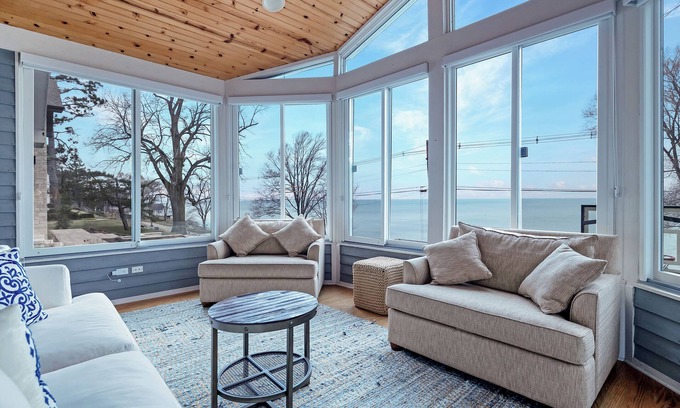Perched on the shores of Lake Michigan, this rare 6-BR, 5-BA lakefront gem offers luxury, charm, and breathtaking views. A retreat for relaxation and entertainment, it features expansive decks, a sparkling pool, a private sauna, and a cozy firepit for sunset gatherings. The bright, elegant interiors blend comfort with style, while the basement game area adds fun for all ages. Every detail invites you to savor the beauty and serenity of lakeside living, making it a one-of-a-kind escape.