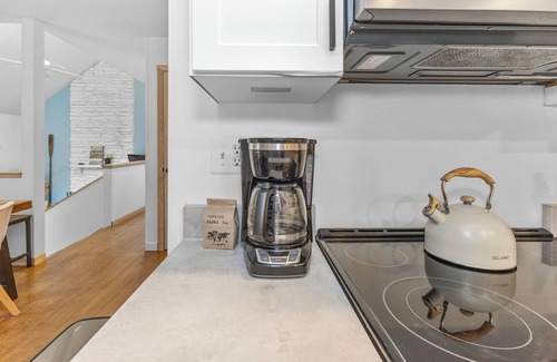 The bathrooms are a refreshing mix of playful and polished, featuring gold-accented fixtures, modern vanities, and creative pops of color. Fresh tilework and curated decor make these spaces as photogenic as they are practical. Downstairs, you’ll also find a full-size washer and dryer set tucked into the lower level, perfect for keeping swimsuits clean and weekend gear ready for more adventure.