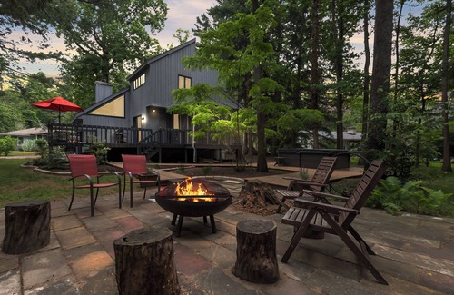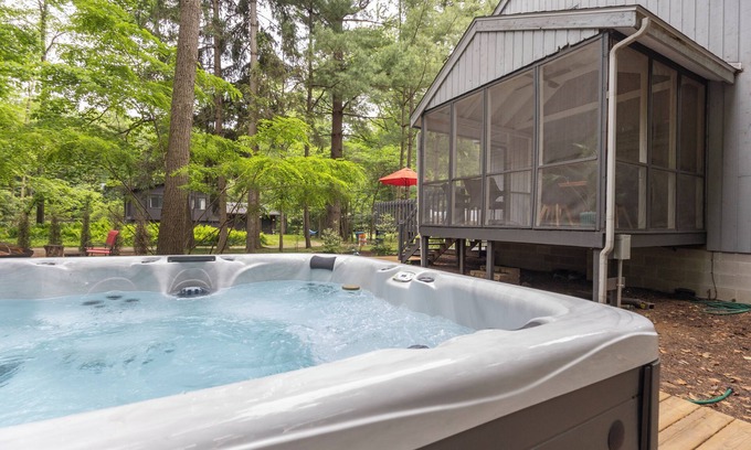 Step outside and discover your own woodland haven. Dine al fresco in the airy screened porch, lounge beneath a fire-red umbrella on the deck, or fire up the BBQ grill for sunset cookouts. A bubbling hot tub sits under the trees, ready for evening soaks, while the stone fire pit, surrounded by stump and Adirondack seating, invites stories and s’mores under the stars. Nature wraps around you, private, peaceful, and perfectly designed for unwinding.