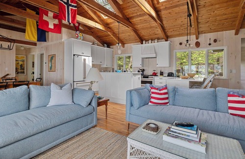 Downstairs, there’s a large, comfortable family room with another flat-screen TV and cushy seating, plus games and beach towels galore. And yes, you guessed it, more lake views.