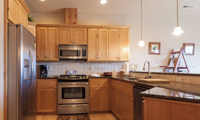 The dining room opens up just behind the living room and guests looking to make the most of a meal together can do so at the table suited for six. Additional seating can be found via the barstools at the kitchen counter. Traveling chefs who can't wait to serve up a home-style meal after a day on the slopes will enjoy the comprehensive culinary space that includes stainless steel appliances, sleek stone countertops, and a brick backsplash to add a touch of rustic charm.