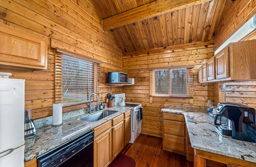 You'll love the layout of this cozy cabin, complete with a comfortable couch to curl up and watch movies or enjoy the fireplace. An indoor jacuzzi tub offers privacy and makes this retreat feel extra special.