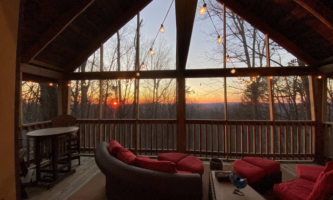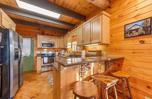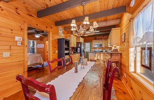 3BR 2BA cabin steps to brow park and downtown. King master on main floor with double vanity bathroom. Queen guest rooms upstairs sharing Jack and Jill bathroom and cozy loft. Decks to spread out and Chill with huge main level screened deck and grill area, another huge open lower deck with swings and rocker and front porch with swing. Fire pit area. Firewood is provided for a $25 charge per night. Please let manager know when booking if you want to add the fee. Steps to all downtown venues and short distance to all area attractions.