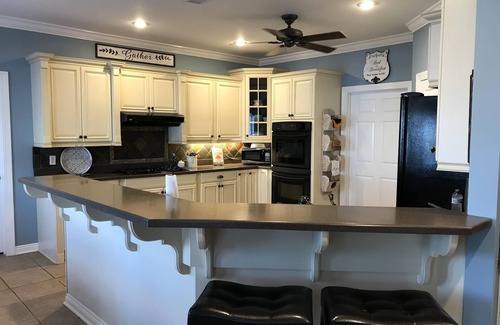 We have a great kitchen with double ovens, gas cooktop, microwave, dishwasher and a large walk-in pantry. The kitchen is fully equipped with everything you need to cook, bake, grill and eat! There is an adjoining wet bar with ice maker. The dining area and screened in porch has total seating for 12. The kitchen, dining and wet bar area all has a lake view.