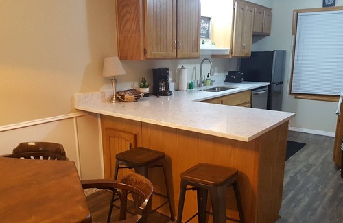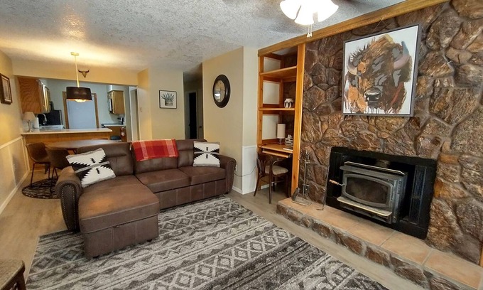 This 2 bedroom condo is located just steps from the ski slopes/mountain bike park and just minutes from the Angel Fire Resort golf course, restaurants, shops, etc. With recent upgrades, you'll find this condo to be the perfect place to relax after a day of skiing, biking, golfing, hiking, ziplining, or whatever activities you enjoy. The fully-equipped kitchen makes it easy to prepare meals and the comfortable living room with woodstove makes for a great place to unwind. The living room has a sectional sofa with a pull out bed and a desk area. There's free WiFi, just in case you need to keep in touch with the outside world. One bedroom features a king bed. The other has a queen over queen bunk bed (top bunk has 200 pound limit). Gold Creek condos offer amazing access to the Angel Fire lifts. There's a shared grill and a shared washer/dryer. This condo is dog-friendly, so feel free to bring your furry family member. The condo has all new furniture, flooring, bathroom vanity, paint, etc. as of July 2021.