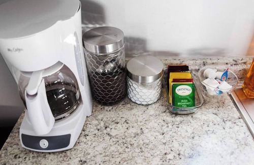 Toward the back of the home, the fully stocked kitchen has everything you need to prepare meals, including cookware, utensils, and small appliances. We’ve also provided some staples—olive oil, salt, pepper—as well as a coffee maker with coffee, teas, creamer, and sugar to get your mornings started.