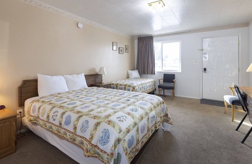 This room features two Queen beds with a private bath including a shower/tub combo to soak in after a long day of exploring. Our motel is one level only, so this room is easily accessible from the parking lot. This room is equipped with A/C, microwave, mini fridge, coffee maker and a large TV with Cable for your comfort and enjoyment.