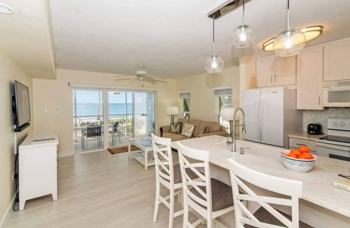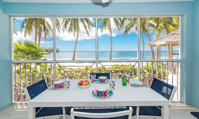 Large windows flood the space with natural light, offering uninterrupted views of the beach and turquoise waters beyond. The open-plan living room includes a comfortable sitting area and sleeper sofa, perfect for relaxing after a day of exploration. The dining space is ideal for casual family meals or cocktails at sunset, and a flat-panel TV with cable is provided for indoor entertainment.