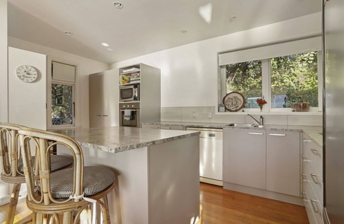 Natural light pours into each of the four bedrooms, with Kaioruru View sleeping up to eight guests across two floors. With panoramic views from the king-size bed, the gorgeous master bedroom opens out to the decking. The three additional bedrooms ensure a restful night's sleep, while the two full bathrooms and laundry facilities add convenience to your stay.