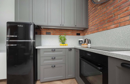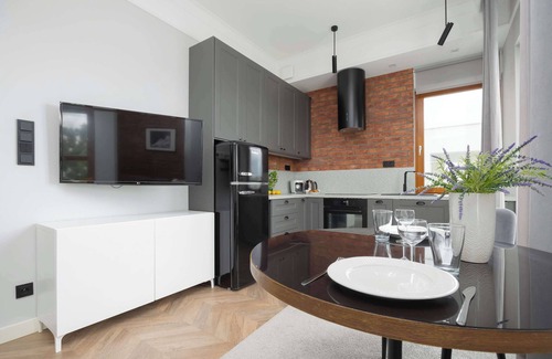 The bright, spacious studio designed for four people has a relaxed, friendly atmosphere that encourages you to stay longer from the very beginning. The interior combines modern functionality with delicate, warm accents, thanks to which it is easy to feel at home here. Large windows let in daylight, and the exit to the balcony allows you to get some fresh air and look at the city from a distance. The well-thought-out layout of the space provides comfortable conditions for both a couple and a family with children. The living and sleeping areas combine here into a harmonious whole. A comfortable bed and a large, fold-out sofa guarantee a good night's sleep and a place to relax together. The modern kitchen has been fully equipped, thanks to which preparing meals, morning coffee or dinner after a day full of sightseeing takes place in favorable conditions. Everything has been designed with everyday use in mind - there is plenty of storage space, a separate work area with a desk and a table where you can eat a meal, play board games or just talk. The bathroom with a shower has been designed with great attention to aesthetics and comfort of use. There is a hairdryer and all the necessary elements that make everyday life easier. The apartment also has a TV with access to streaming platforms and fast Wi-Fi, which allows both entertainment and remote work. Guests can also use a fan, which can be removed from the wardrobe if necessary. The facility is located in a modern building with an elevator, and an additional convenience is access to underground parking. This place combines everything you need for a peaceful rest in the city - comfort, aesthetics and a good location. Ideal for joint trips for two or family stays with children.