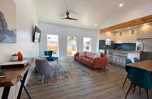 Experience the Kanab magic at Timber + Tin D! This modern gem offers two bedrooms and two bathrooms, and sleeps 6. Relax in resort-style comfort, enjoy shared amenities like the pool, hot tub, and recently restored, historic game barn and explore the wonders of Kanab and southern Utah. We're close to Zion, Bryce and The North Rim of the Grand Canyon National Parks, Antelope Canyon, Horseshoe Bend & other adventures in the area.