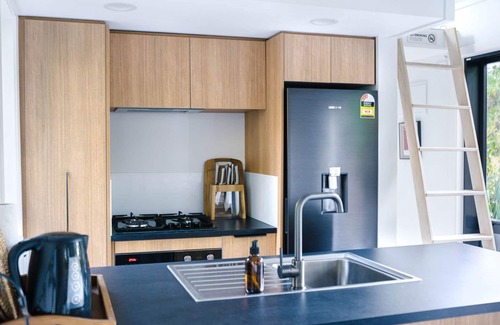 Includes a fridge, freezer, stove, sink, dishwasher, toaster, water kettle, coffee plunger, wine glasses, cutlery and cooking essentials. There are stools at the bar to sit and eat or enjoy the nearby sofa or outdoor seating area!