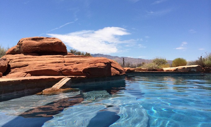Beautifully appointed home with antiques and hand crafted designs by owner artist. Master king bedroom has an ensuite with jetted tub, stand alone shower, large closet with laundry and private views of the most unique out-cropping of rocks in all of Kayenta. Two queen bedrooms and another bath are situated on the other end of the house. Custom kitchen and large dining area walkout to a picture perfect pool and large patio where the sunset view and starlit sky are out of this world. Perfect winter retreat for retired couples.