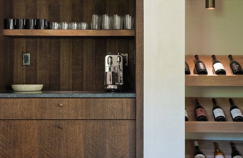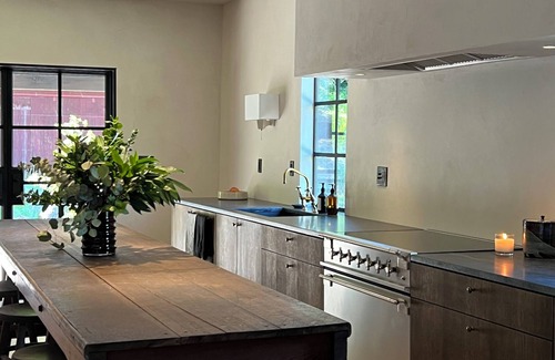 KITCHEN/DINING: Sharing the main floor is the large fully stocked eat-in kitchen. Influenced by our European counterparts, this kitchen was designed without a dining room in mind as intended to eat and congregate around the working island, family style. The space has been outfitted with modern luxury conveniences such as the induction AGA range, Bosch appliances as well as a dedicated coffee/bar area with a Breville Nespresso machine and wine library. Peet's Nespresso pods and Smith Teas are provided for guests to enjoy.