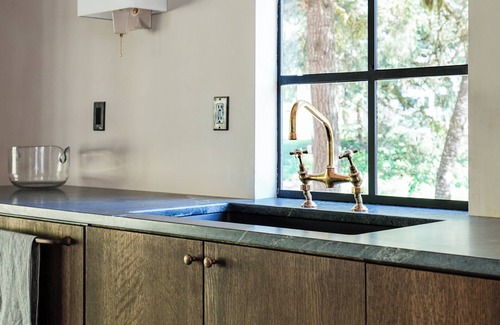BATHROOMS: There is one bathroom located on the main floor and one attached to the primary bedroom. The bathroom on the main floor features a plastered tub/shower, marble floors, double sink vanity and Rohl and Barber Wilson plumbing fixtures. The upstairs ensuite bathroom within the primary suite provides a luxury plaster shower with skylight looking into the forest canopy. This bathroom has a single sink vanity and Rohl fixtures and marble floors as well. Luxurious Sangre de Fruta toiletries are provided throughout the house for our guests.