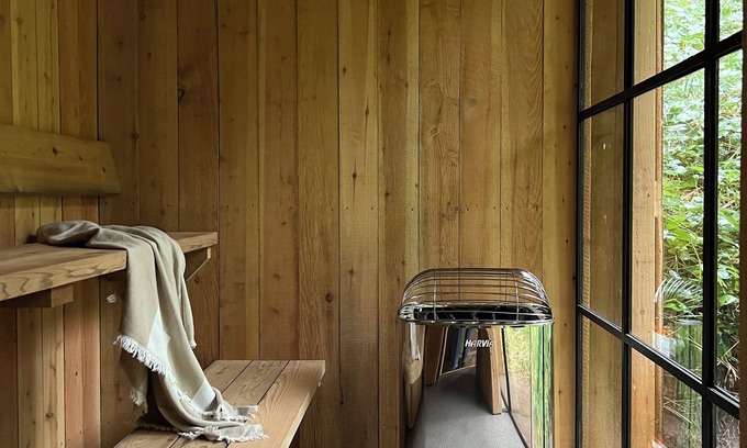 OUTDOORS: KD Country House is located on six and a half acres. We encourage our guests to safely and respectfully explore the property and surrounding wildlife. The property has a natural spring in the front yard which flows all year long and attracts wildlife as well. It's a wonderful place to sit and relax any time of day and enjoy the water and surroundings. In the immediate spaces around the house, our guests will enjoy multiple seating and eating areas. Under the front covered porch is a small hybrid eating/sitting area, great for morning coffee, evening wine or an informal meal. The propane BBQ is located here, right off of the French doors leading to the kitchen. Out the back of the house is a larger outdoor dining area with umbrellas, surrounded by trees and perfect for any meal. Beyond the dining area is another sitting area with propane fire pit, a great place to enjoy the evening. Up the hill from the front door you will find a newly built cedar sauna and relaxation room within the old tin shed, the views and vibes from this idyllic spot are magic!