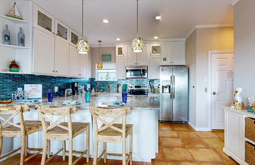 The third floor is the heart of the home for cooking and gathering. The living room provides a place to congregate with a large plush sectional with pillows, two matching armchairs and a wall-mounted TV. Take your morning coffee out to the back balcony to take in the dazzling sunrises and full Gulf views. Prepare family meals in the full kitchen with stainless steel appliances, granite countertops, blue back splash, top-end Cuisinart and Ninja counter appliances such as a filter-less coffee maker, blender, food processor, dishes, children's dinnerware and cups, basic cookware and utensils.