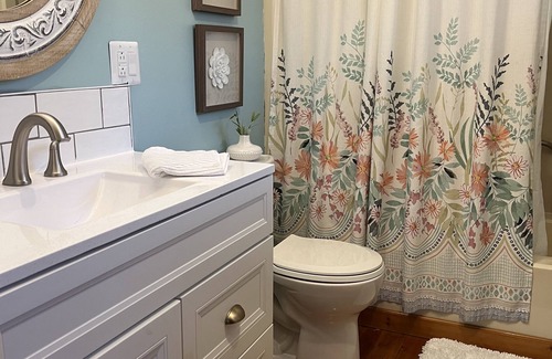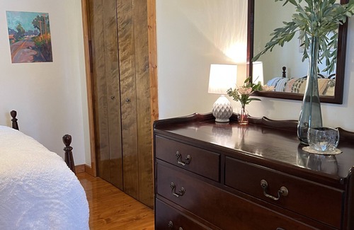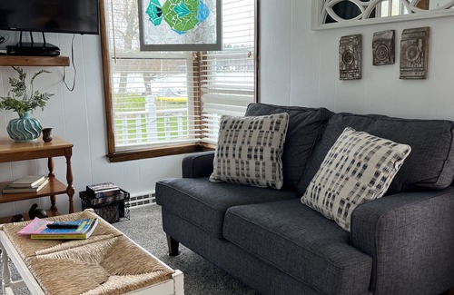 Keeney Kottage has central air, 2 bedrooms Master with Queen, 2nd bedroom with Full bed. The living room has a full couch (not pull out). The bungalow in the garage sleeps 3-4, great for kids or extra family needing their own space. The bungalow is finished with air- conditioning and a window – just a few steps from the Kottage. Remodeled galley kitchen with granite and microwave. Full bath and washer and dryer. The cottage has been fully remodeled and well maintained.