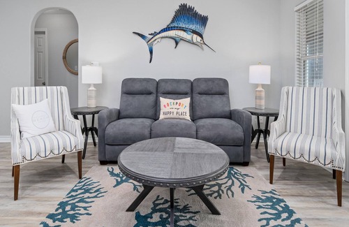 The four bedrooms at Keepin’ it Reel are spacious and each feature flat-screen TVs with Roku sticks, ceiling fans and plenty of storage. The primary bedroom has a king-size bed and an en-suite bathroom with a walk-in shower. The second and third bedrooms have queen-size beds. The fourth bedroom is spacious and features a queen-size bed, full-size bed and a twin-size bed. Three of the four bedrooms have direct balcony access for early risers to enjoy the sunrise. The second bathroom has a shower/tub combo. Feel free to pack light! All bedding and linens are provided, and the washer and dryer in Keepin’ it Reel ensures you can throw a load in whenever you need to.