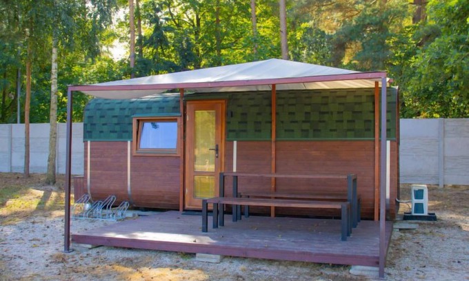 Child friendly holiday village "Kemp Stříbrný rybník". 25 houses in the resort. In the district of Malšova Lhota, 5 km from the centre of Hradec Králové, along the wooded area, on the lake. For shared use: property. Table tennis, boccia (extra), beach volleyball, arbour, barbecue, fireplace, children's playground, bathing jetty. In the complex: reception, restaurant, bar, bistro, playroom, washing machine (for shared use, extra), bicycle rental. Parking (extra) on the premises. Bus stop "Stříbrný rybník" 700 m, railway station "Blešno" 5 km, sandy beach 50 m, bathing lake "50". Sports harbour, minigolf, sports centre, walking paths from the house, cycle lane, fishing possibilities 50 m. Nearby attractions: Adventure park Firmsport, letní kino, tutistický vláček do lesa, Stezka siluet, Rytířské hradiště 3 km, Park Na Větvi 3 km, Obory se zvěří 4.2 km, Obří akvárium, Botanická zahrada 4.7 km. Hiking paths: Pohádková, Vodnická stezka 6 km, Planetárium, planetární stezka 8.4 km, Zoopark Stěžery, Rozhledna Milíř 15 km. Please note: entertainment in the season. Suitable for families. Fishing [permit required]. The photograph shows a typical example.