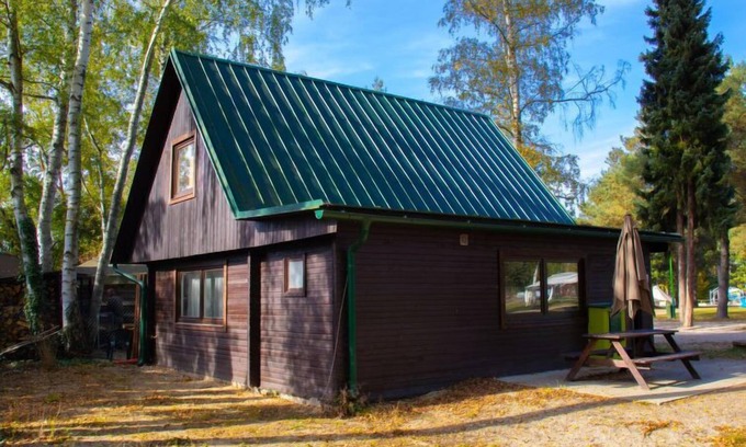 Child friendly holiday village "Kemp Stříbrný rybník". 25 houses in the resort. In the district of Malšova Lhota, 5 km from the centre of Hradec Králové, along the wooded area, on the lake. For shared use: property. Table tennis, boccia (extra), beach volleyball, arbour, barbecue, fireplace, children's playground, bathing jetty. In the complex: reception, restaurant, bar, bistro, playroom, washing machine (for shared use, extra), bicycle rental. Parking (extra) on the premises. Bus stop "Stříbrný rybník" 700 m, railway station "Blešno" 5 km, sandy beach, bathing lake 50 m. Sports harbour, minigolf, sports centre, walking paths from the house, cycle lane, fishing possibilities 50 m. Nearby attractions: Adventure park Firmsport, letní kino, tutistický vláček do lesa, Stezka siluet, Rytířské hradiště 3 km, Park Na Větvi 3 km, Obory se zvěří 4.2 km, Obří akvárium, Botanická zahrada 4.7 km. Hiking paths: Pohádková, Vodnická stezka 6 km, Planetárium, planetární stezka 8.4 km, Zoopark Stěžery, Rozhledna Milíř 15 km. Please note: entertainment in the season. Suitable for families. Fishing [permit required]. The photograph shows a typical example.