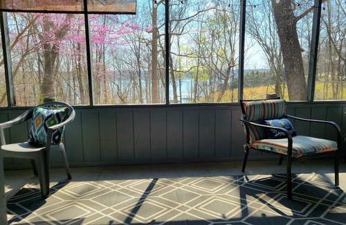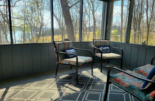 Kentucky Lake house with lake view. Main floor has bedroom with a queen bed and bunk room with door that leads to screened porch with view of Kentucky Lake. Perfect area to have coffee in the morning or a few beers at night.