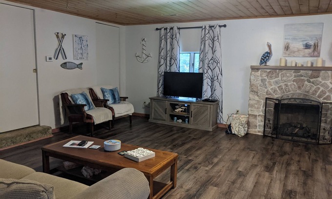 Open floorplan in living and kitchen area with large dining table and comfortable couch. Two full baths on main floor. New washer and dryer. Basement has another bedroom with king bed and another living area with additional sleeping including another queen bed and queen air mattress. Cot and twin mattress if needed. Wifi and a smart TV with dvd players and movies. Fire pit. Plenty of parking. 2 grills, charcoal and gas. Minutes to Sportsman's Anchor with boat ramp and covered docks, food, bait and pontoon rentals. One minute to Jonathon's Creek boat ramp. Less than ten minutes to Dollar General Store and liquor store.
