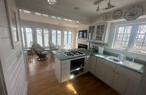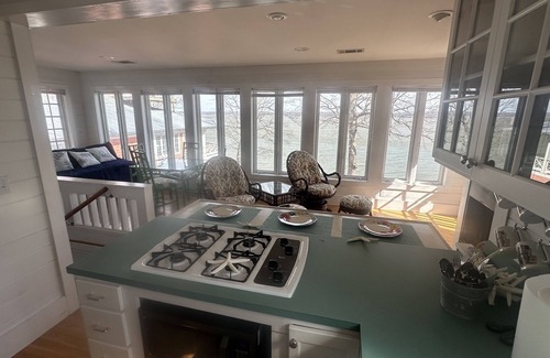This adorable lake house is directly on the main Kentucky Lake and boasts one inviting bedroom with a comfortable queen bed and a huge walk-in closet. The kitchen allows you to prepare your food and drinks while taking a moment here and there to step out on the balcony off the living room to watch beautiful sunrises or sunsets. Take time to watch all the various kinds of boats float before you. It also has an additional room downstairs to relax, read, or watch television as you enjoy a cold adult beverage while cooking out on the deck directly outside French doors also overlooking the lake. This property allows access to an Outdoor Kitchen that has a charcoal grill, gas burning stove top, sink, refrigerator, and comfortable outdoor chairs to relax and enjoy lunch or evening meals. Afterwards, head down to the boat dock to swim, fish, or work on your tan. Come immerse yourself in the serene atmosphere of this charming lake cottage retreat. This beautiful lake house is designed to welcome and accommodate a couple possibly celebrating an anniversary, special occasion, or just in hope of building new memories with that special someone, that one person they are excited to share some alone time with. Experience what lake life has to offer with a stay at this delightful lake house cottage. Escape the hustle and bustle of everyday life and create lasting memories in this idyllic getaway that offers everything imaginable at a large, beautiful lake, including the nearby Moors Marina and Ralph's Restaurant just minutes away by boat or vehicle. There truly is no better place to enjoy time together sharing what is commonly known here as the Million Dollar View!