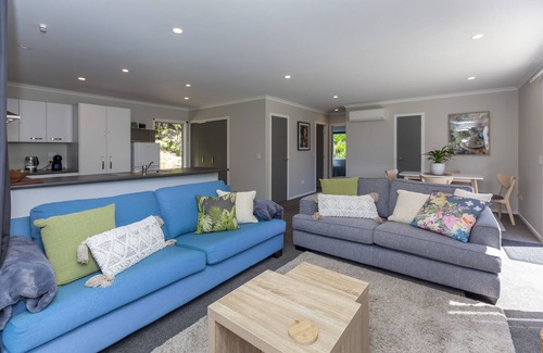 Unwind in the tranquil relaxing cottage set amongst bird-rich native bush. At the top of the road is a stunning view of Kapiti Island. Out of the way and yet 5-15 minute drive close shops beautiful beaches, river, stunning bush walks, cycle tracks, aquatic centre and golf courses.