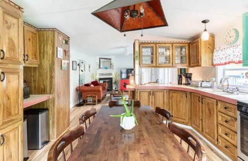 Enjoy the covered porch - even in the rain! Watch the birds from the swing chair, relax and draw at the outdoor easel, work at the outdoor desk or play cards or board games on the porch table. The back deck - sit back and take in the fresh air with your morning coffee on the Adirondack chairs on the back deck. Brand new grill and 6-seat table with umbrella. Living room with two leather sofas, beautiful working fireplace. Fire wood supply ready to use on the porch. TV has streaming channels including Netflix and live TV. Wi-Fi. Fully equipped kitchen, stove, microwave, coffee maker, kettle, toaster, indoor/outdoor dishes (no dishwasher) chef quality knives and pots. Closets in both bedrooms, small desk in the master bedroom for laptop or writing.