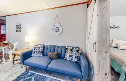 The tidy, two-bedroom interior features an open layout and modern updates including a wall-mounted smart TV in the living room and stainless steel kitchen appliances. A powerful, mini-split AC unit provides all-season comfort and in-home WiFi offers convenience and entertainment.
