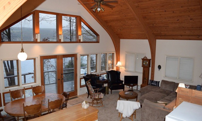 Relax Lakefront in KeukaWindsong on East Bluff Drive your next Upstate NY Finger Lakes vacation. The custom built glass front home resides on the Penn Yan lake branch along the serene East Bluff Road side of the Y shaped Keuka Lake. Just two miles from Keuka College, the home sits hillside and garners a broad sweeping view of the lake. This inner shoreline provides the tranquil traffic free side of Keuka Lake. Tucked off the road among the trees, the custom built, two story, 1650 square foot home, boasts soaring exposed arched beam with tongue and groove ceiling construction. The vaulted space combined with glass front home sits midway in elevation between the road and water’s edge. Just steps from the house to the water but set high enough to view and enjoy the lake activities without having your serenity disturbed. For you early risers, experience the spectacular sunrise from the deck as it rises above the vineyard lined hills across the lake and shines across the water. At the end of the day light a fire in the fire pit on the beach and watch the moon set beyond the hills and shine across the lake as you sit on the beach at water’s edge. The lake is ringed with fires during summer holidays, creating a spectacular sight.