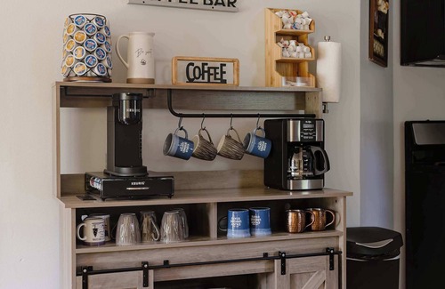 Inside, you'll find a fully stocked kitchen complete with a dedicated coffee bar—perfect for slow mornings before heading out to explore. The warm and inviting living room features a cozy electric fireplace, ideal for family movie nights or curling up with a good book.