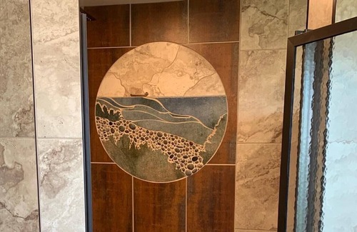 The Turret Suite is our signature suite and the reason we call it the Keweenaw "Castle" Resort. A turret is a rounded portion of a castle and is typically the highest point in the home. This suite encompasses the entire third floor and is ladened with custom woodwork. It hosts a queen sized electric frame bed, an in-room wet bar with a copper sink surrounded with hand painted tiles depicting the building of the castle and other area attractions in the Keweenaw. It offers a beverage station, a mini fridge, a wine ensemble and a microwave. It also come with a telescope for star gazing and daily freighter sightings. The new private bath is sure to delight!! ;) All suites come prepared with quality linens and robes for use during your stay as well as all toiletries. Enjoy unlimited coffee, tea, snacks, or your own beverages (ice available), and use of the guest grill as you lounge away your day on the property.