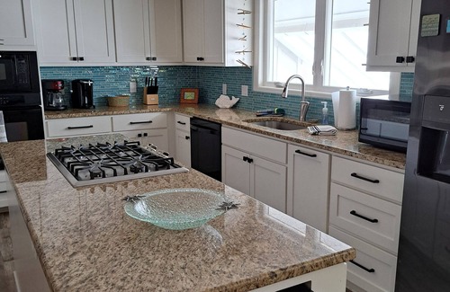 Upstairs is the Main Living Area with beautiful Kitchen . A gorgeous dining table with bench seating allows for most to sit comfortably or extra guests may choose to sit at the bar counter that faces the kitchen. Living Area opens up to a great balcony that overlooks the canal and to Little Bay. 2 Bedrooms on this floor - King Bed and 2 Twins with a Jack and Jill Bathroom between. There is a cute little area for the kids behind the bedroom with twins, for games or even a couple more to sleep. One more Half Bath is located on this floor.