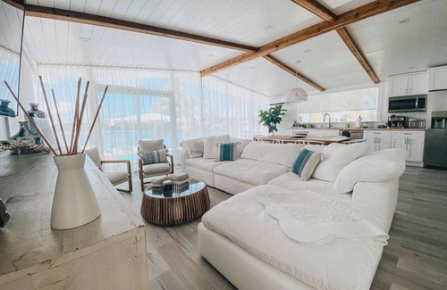 Come enjoy our beautiful home on the open bay! The home has breathtaking panoramic views from our open floorplan. Here you will come to find peace and serenity with a refreshing breeze as you dip your toes in the private sand beach, while awaiting the sunset from the dock. (Pool is currently unavailable)