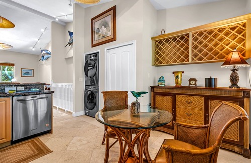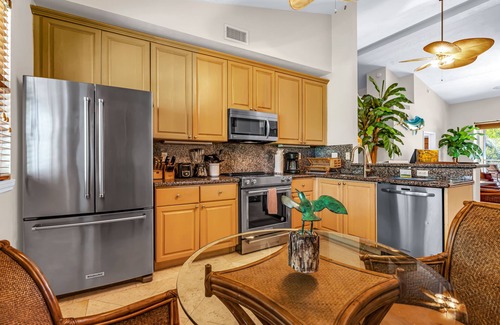Nestled in a secluded and quiet lush tropical setting. This is a Two bedroom, two bath 2nd floor condo with gorgeous marbled floors, cathedral ceilings and an open floor plan with wonderful Tommy Bahama furniture and decor, a complete modern kitchen with granite countertops, stainless steel appliances, microwave oven, dishwasher, coffee maker, toaster and blender, washer and dryer. Features include a spacious balcony, an en-suite bath and a large soaking tub with separate shower and a spacious terrace overlooking a secluded and lush tropical view. About 1,400 sq ft.