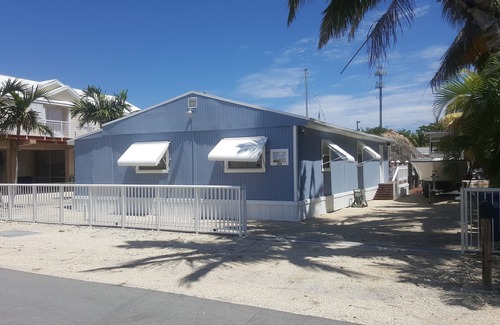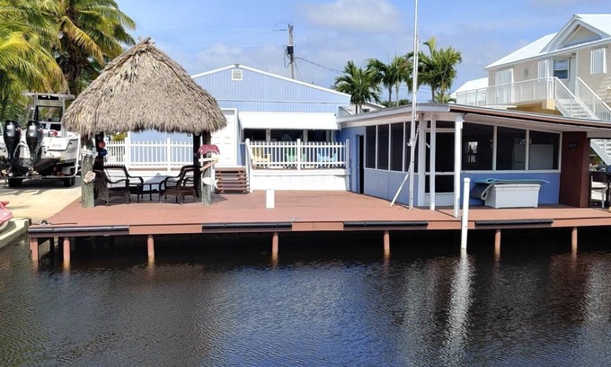 28 DAY MINIMUM . THIS 1300 SQUARE FT. WATERFRONT HOUSE IS ALOT OF FUN AND FULL OF COLOR! LARGE BACK WATERFRONT DECK, TIKI HUT , LARGE SEPARATE, DETACHED SCREENED IN PATIO DINING WITH 64 INCH OUTDOOR TELEVISION. 4 BEDROOMS , ALL TILED ,NO CARPET . THREE BATHS AND LARGE ENOUGH FOR 6 ADULTS AND TWO CHILDREN. SEPARATE OUTDOOR, LAUNDRY ROOM . LARGE DOCK FOR YOUR BOAT AND LARGE FISH CLEAN STATION . NO STAIRS JUST 5 STEPS! BAYSIDE , 3 MINUTES BY BOAT TO THE BAY, AND 15 MINUTES TO JOHN PENNEKAMP . CLOSE TO BACK COUNTRY AND ATLANTIC FOR GREAT FISHING . NORTH END OF KEY LARGO MEANS NO TRAFFIC ! THIS HOUSE IS ON A QUIET CUL-DE-SAC WITH GREAT NEIGHBORS ALLOWING YOU AND YOUR GUESTS A PEACEFUL AND FUN TIME !