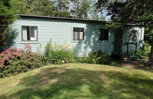 Our comfortable cabin is private. Surrounded by woods with a view of the ocean and passing boats through an opening in the trees. Our beach is accessible via a long boardwalk leading from the side yard. Great beach walking and shelling and a place for picnics.