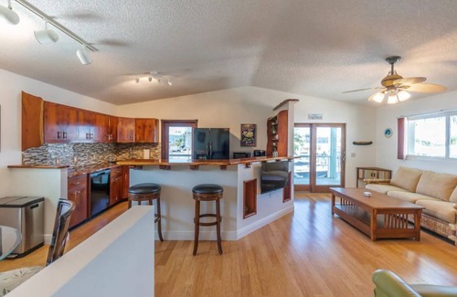 Located down the canal from the Bay with many attractions and dockside restaurants nearby. Enjoy the large outdoor patio including a private covered jacuzzi and a brand new 70' dock and 2 Kayaks available for your personal use