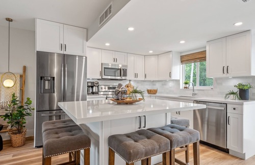 This three story townhouse is equipped with two living rooms, perfect for the kids to have their own space. The main (second) floor has a large living area with a 60" Smart HDTV, large windows and sliding doors and balcony overlooking the lagoon which brings in natural light. The living room seating includes a large 103" leather plush couch, two chairs and two ottomans close by for additional seating. This main floor also has a full bathroom and the kitchen. The new modern white kitchen has seating for six at the large island (plus 2 additional folding stool). It has new calacatta quartz countertops, all new stainless steel Samsung appliances, a new coffee maker with both a Carafe and single serve coffee pods.